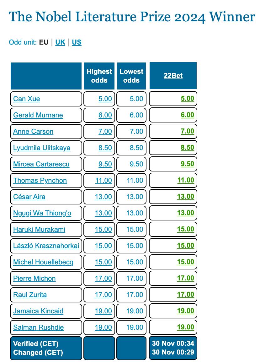 前段时间,英国著名博彩公司Nicer Odds的网站(远离赌博,本处引用网站数据仅供作家关注度参考)公布了对2024年诺贝尔文学奖的最新预测。