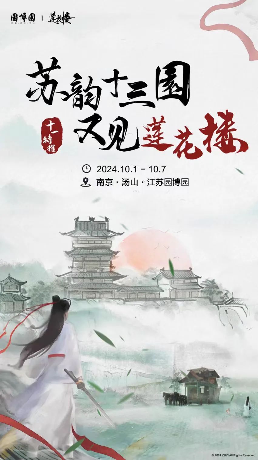 首先,苏韵十三园联名爱奇艺顶级流量影视IP《莲花楼》打造的沉浸式线下游园活动——苏韵十三园又见莲花楼十一特辑,将在国庆启航。此次联合将沉浸式打造剧中经典场景,轮番上演多出“好戏”。