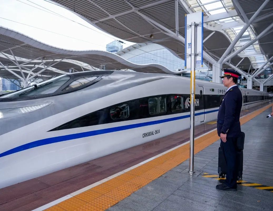 7时整,面向动车车头,童建国直立目视,对着车头上中下比画,检查车头外观,确认头灯、玻璃、雨刷状态。7时18分,确保一切无误后,童建国牵引手柄,列车随即从武汉站缓缓启动。6分12秒后,时速逐渐增至303公里,G1001次列车满载1000余名旅客向着长沙方向疾驰。