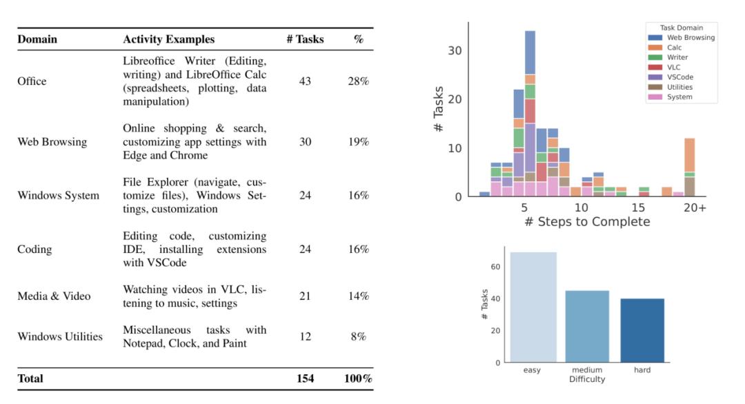 我们提出的 WAA 将进一步扩展 OS World 提出的 Benchmark。由于 OS World 主要包含 Linux 系统的任务,而缺乏 windows 平台上的任务,我们针对 Windows 平台上的任务进行了扩展。我们一共设置了 154 个用户在 Windows 上日常会涉及到的任务,包括浏览器、文档管理器、视频播放、编写代码和常用的应用程序(记事本、画图、文件浏览器、时钟和设置)等。