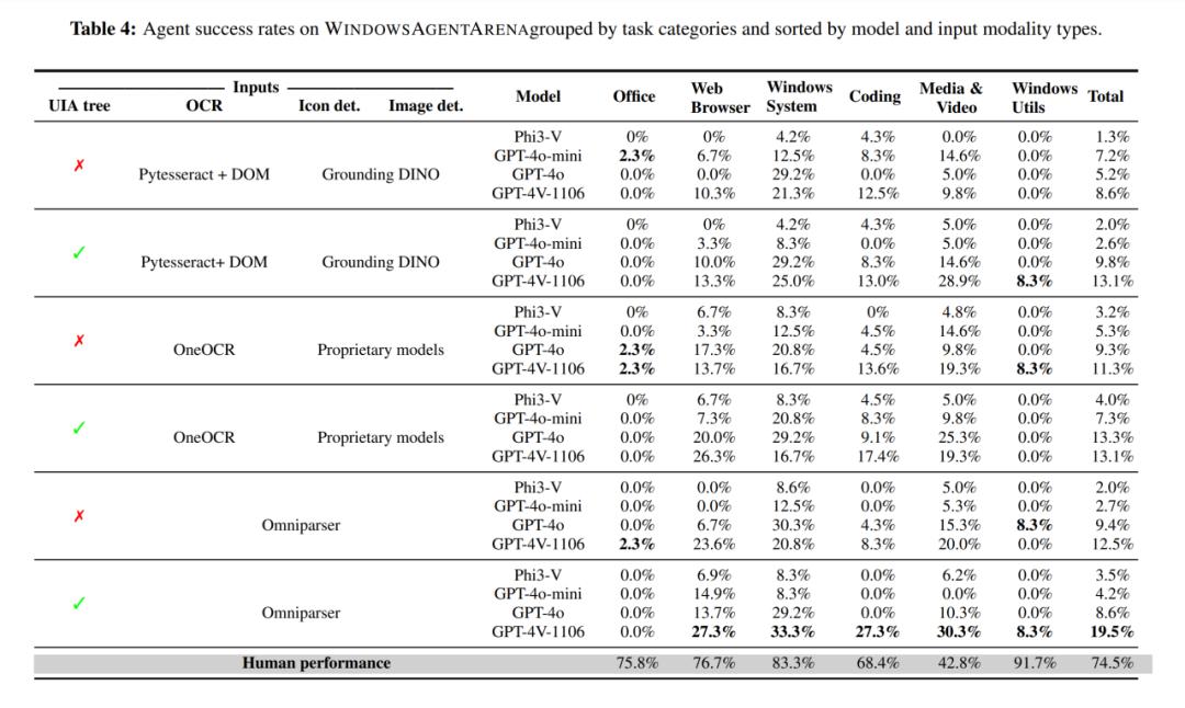 我们的技术报告对比了基于不同大模型的 Computer Agent 的能力。除了大模型之外,我们使用了小型的视觉模型,例如微软开发的 Omniparser 模型, OCR 等等来解析屏幕截图、 识别图标和图像区域。然后,我们将预处理的信息发送到 GPT-4V(或者 GPT-4O, Phi-3V),从而得到下一步在计算机上需要执行的命令。在我们测试的模型中,最好的 Agent 解决了 19.5% 的任务(任务部分完成没有得分);而一个人在没有外部帮助的情况下得分为 74.5%。我们发现各个任务类别之间的差异很大:大约三分之一的浏览器、设置和视频任务能被成功完成,而大部分 Office 任务都以失败告终。现阶段,Agents 仍然会有很多缺陷,例如我们也发现了由于在执行低级动作或推理时出错导致的情况。