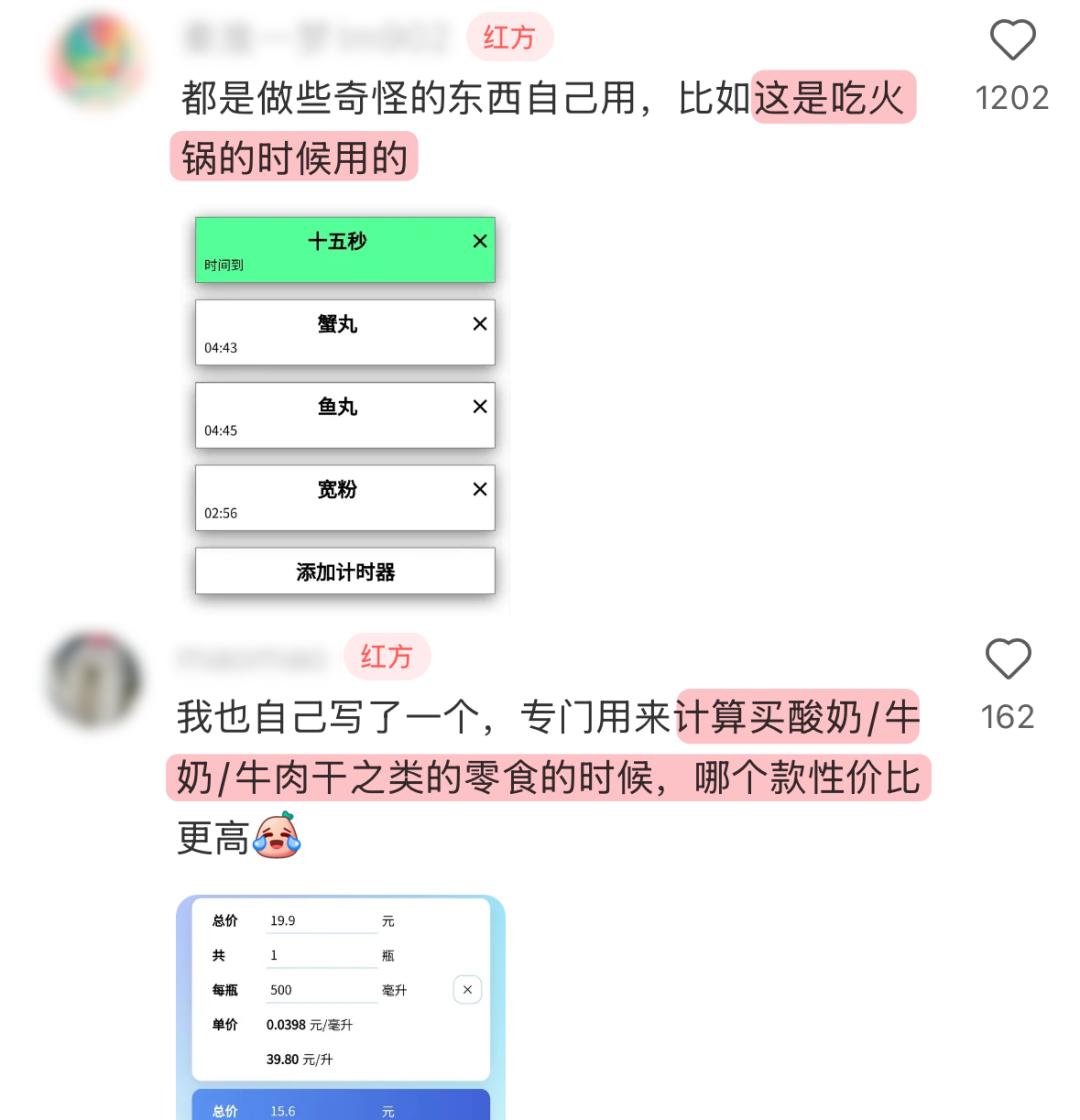 还有人做了一个火锅计时器,涮哪个食材就点哪个倒计时;也有人做了一个零食价格小程序,买东西时输入价格和毫升,马上算出最便宜的那款。