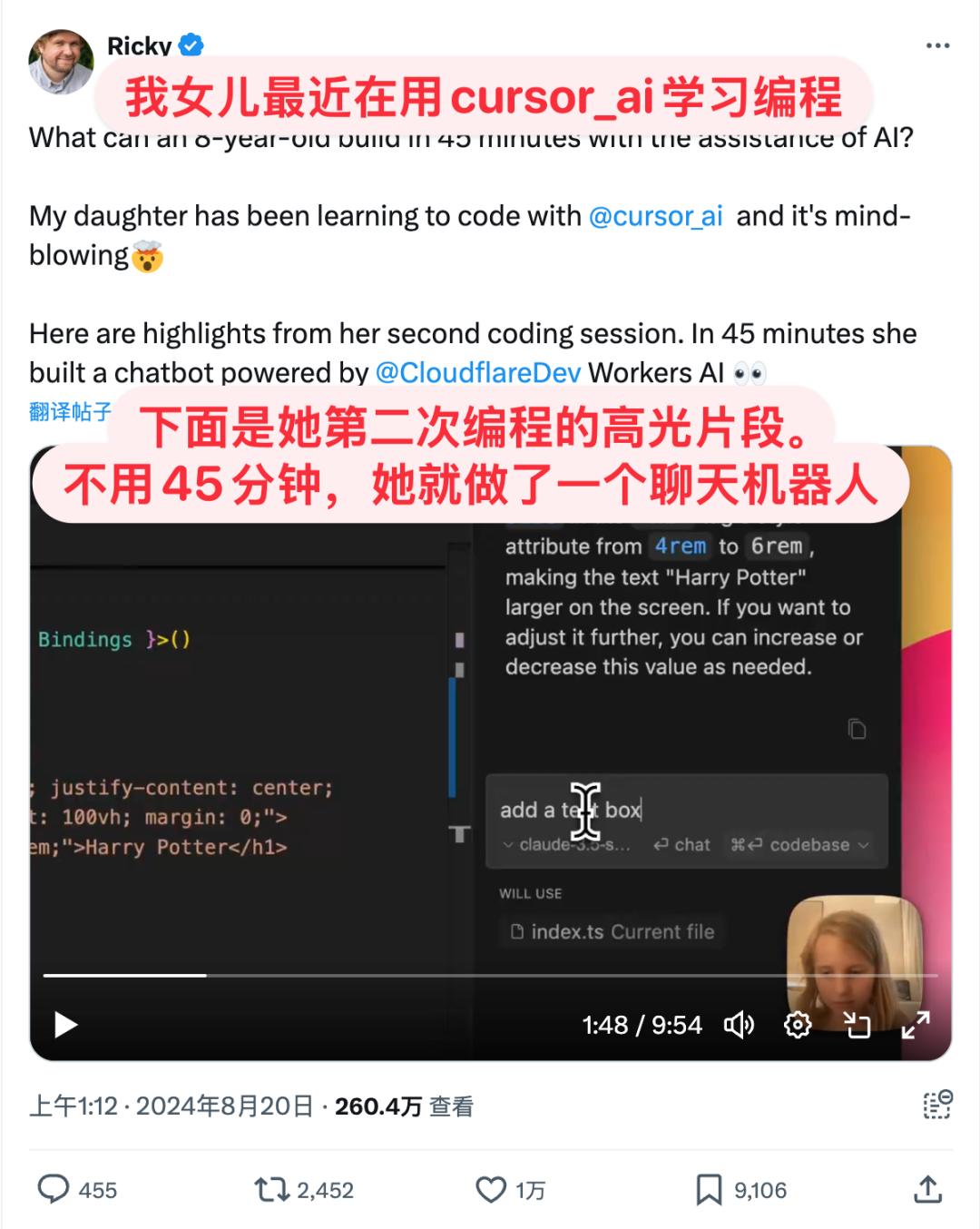 比如 Cloudflare 的一个副总裁就发推特说,自己 8 岁女儿在第二次用 Cursor 学习编程后,不用 45 分钟就做了一个 AI 聊天机器人。