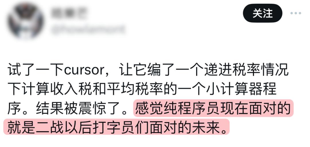 Z 的工作有一半时间都在敲代码,而 Cursor 能帮他减少查资料,写重复代码,写简单代码,确实可以提高一些效率。不过 Z 表示 Cursor 这水平离替代程序员还早。