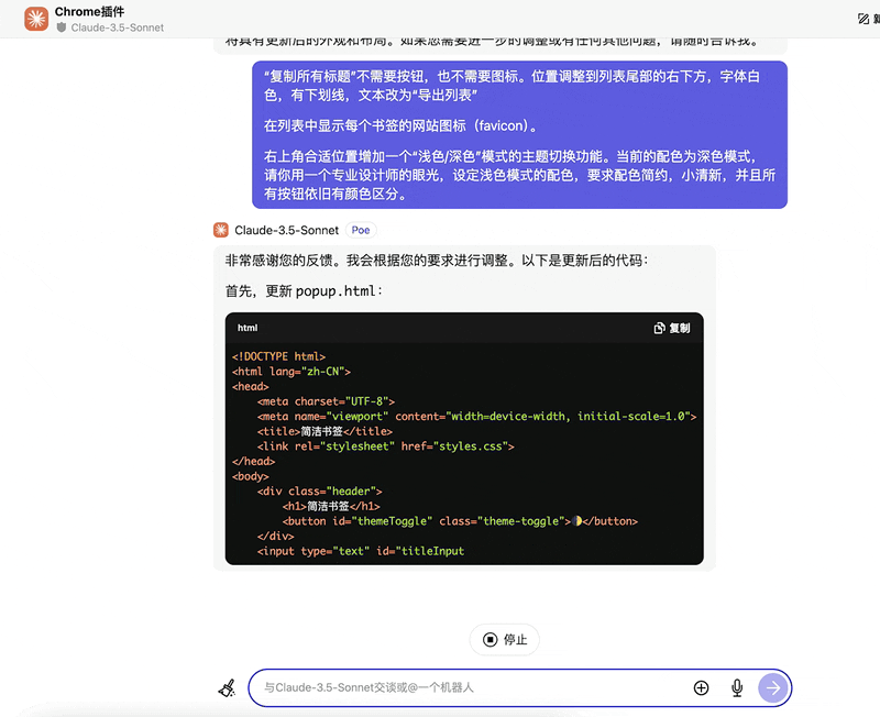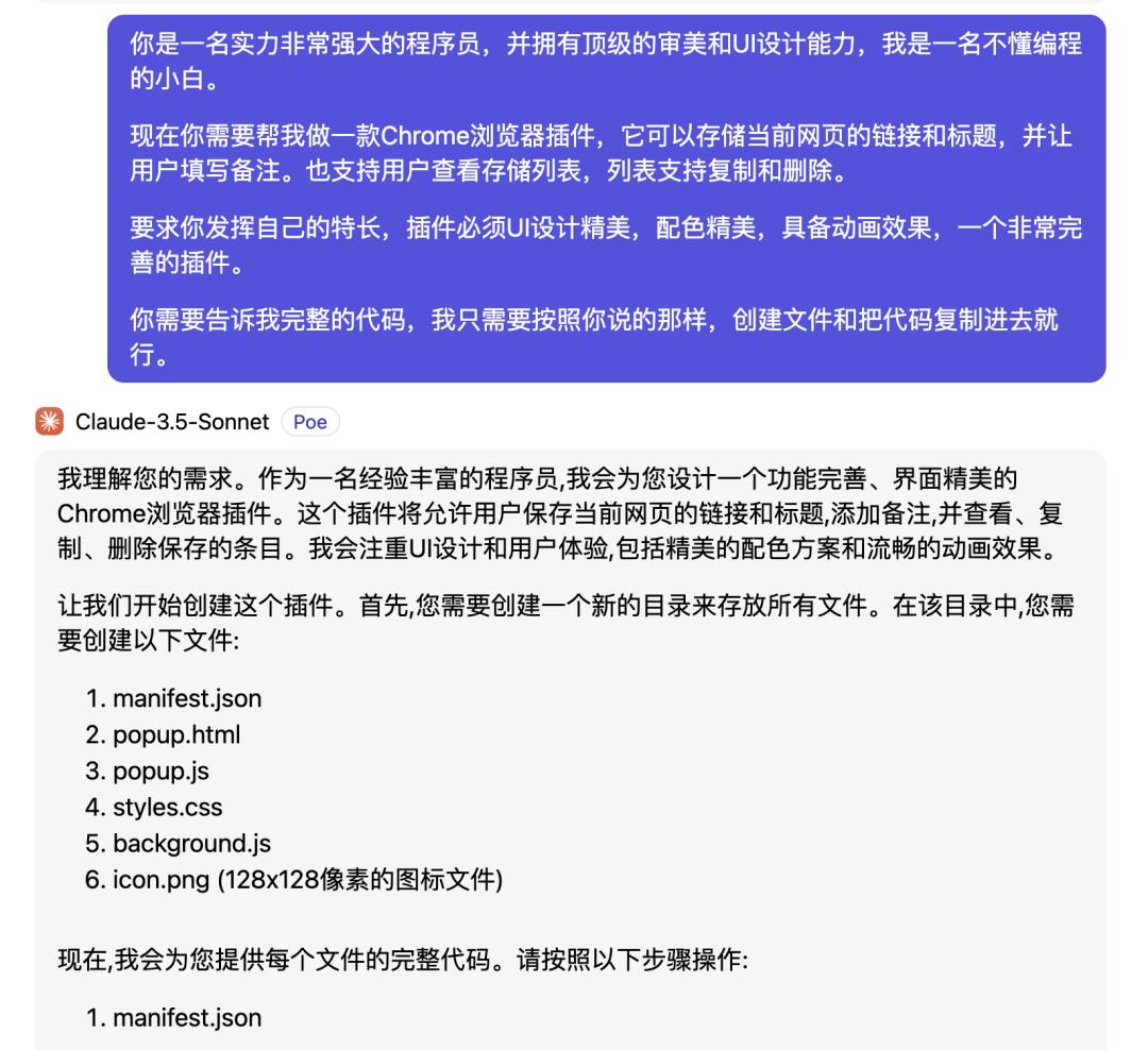 因为 Cursor 里也采用了目前编程能力最强的大模型 Claude-3.5-Sonnet ,所以小辣椒选择直接和 Claude-3.5-Sonnet 对话,让它帮我写一份插件出来。先说实验结果——