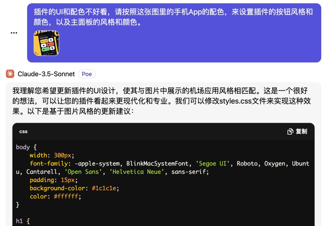 插件基本功能做好后,小辣椒觉得按钮的颜色不好看,就发了一张素材让它参考。它也能根据图里的配色,修改按钮,只是颜色有点色差。