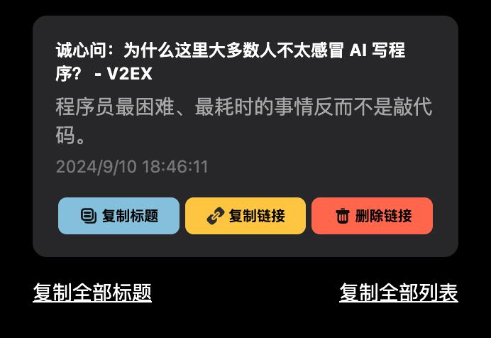 这样,我在复查时可以快速知道这些网页的要点。插件还能复制所有网页标题,点击一下就是一份完整的参考资料,不需要自己一个个理了。