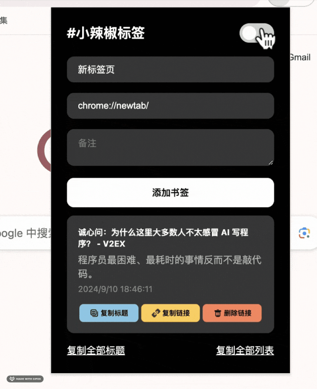 插件功能很简单。小辣椒写文章时要翻很多资料,有时查多了,回过头就忘记哪个网页讲了啥。