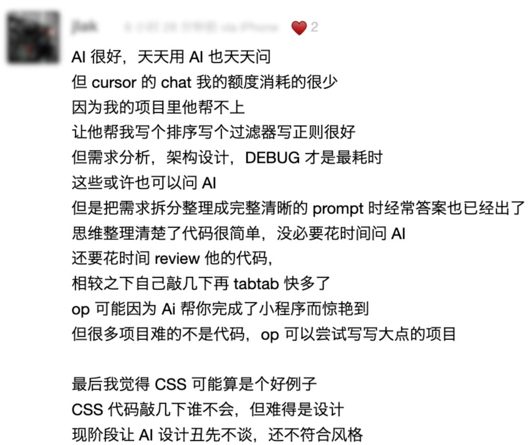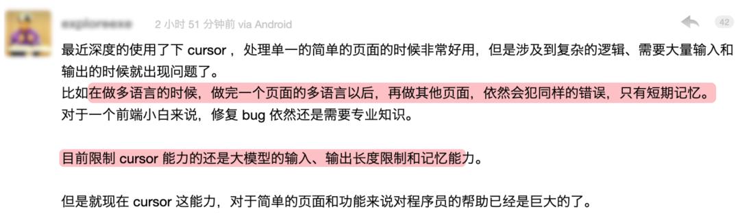 其实类似的观点,出现在很多程序员上。有人深度体验后,觉得它处理简单页面时非常好用,但涉及到复杂的逻辑,需要大量输入和输出的场景,它就很容易出问题。