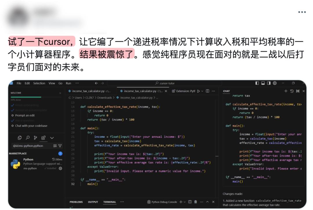 推特上有个网友说让 AI 写了一个计算税收的计算器,说自己被震惊了,并指程序员可能要失业了。