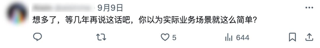 不管架构设计,调试修复 BUG ,还是面对用屁股决策的产品经理和客户,对记忆力不够久远,无法处理复杂逻辑,不懂人情世故的 AI 来说,都是难以处理的问题。