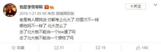 别看李雪琴现在在娱乐圈混的风生水起,其实熟悉李雪琴的人都知道,她一开始出道时,虽然在很多人眼里对她都有 “北大才女”的光环,但她却自嘲是“北大废物”,还多次调侃: