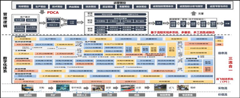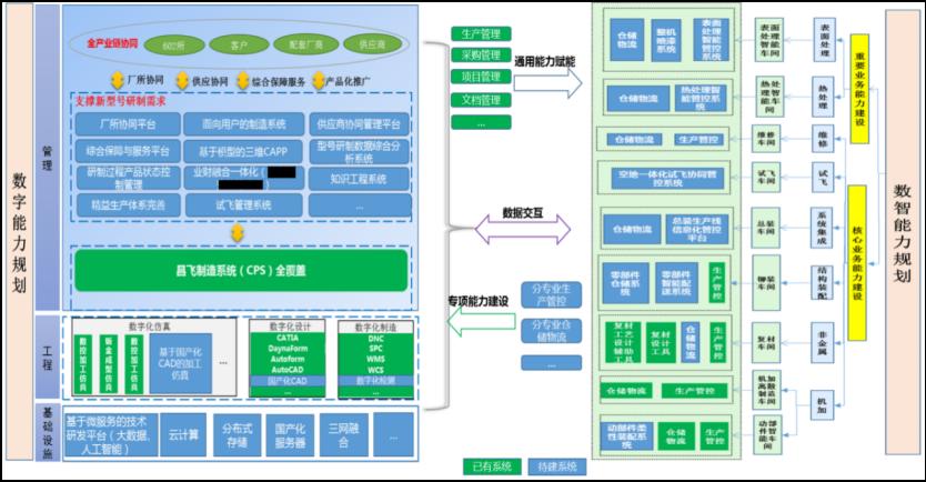 以管理与信息化融合的建设理念,借鉴先进成熟数字化转型标杆企业的建设经验,结合企业数字化建设现状,基于架构引领开展“云大物移智链”等前沿技术的研究与应用,打造可实现多系统、多工具、多要素融合的信息化系统研发平台;围绕企业经营管理和科研生产等全业务、全流程,以数字化管理理念为引领,通过信息化系统研发平台,对业务流程进行优化与重塑,基于过程管控推动数据治理,从而打造流程和数据双轮驱动的数字化管理体系,构建自主可控的昌飞制造系统(CPS)。