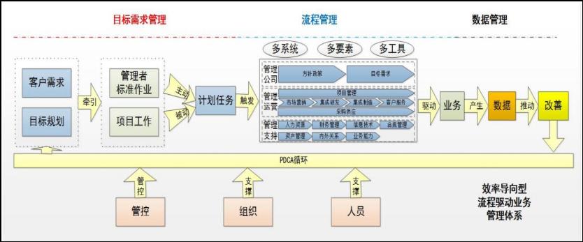 针对传统职能式管理容易造成业务堵点、难点等问题,将流程驱动业务模式通过信息化落地(如图2所示),通过将业务表单化、表单流程化并通过信息化落地,打破传统部门职能型管理壁垒,实现端到端流程的串接与贯通,从而畅通目标需求管理、流程管理、数据管理通道,依托数据管理强化业务管理与执行。