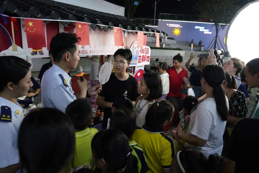 “消防夜市开摊咯,走过路过不要错过!”9月29日,第十五期“消防夜市·守护潇湘”志愿服务活动在永州市道县举行,“蓝朋友”们支摊子、放展板、搭桌子,并摆上消防宣传手册和各类小礼品,忙得不亦乐乎。随着几声吆喝,摊位前迅速围满群众。现场设置了多个互动区域,烟感探测器科普小实验、消防安全知识科普、消防绕口令、非遗漆扇制作等环节,吸引了大量市民参与,为群众带来了一场精彩纷呈的“消防知识盛宴”。