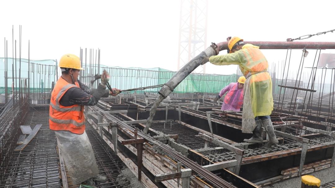 在C塔楼49楼楼顶,尽管天空中阴雨连绵,雾气缭绕,但是工人们干活的热情丝毫没有受到影响。现场,机械轰鸣,冒着腾腾热气的混凝土从机器中喷出均匀地铺撒在板面上,不同工种分工协作、有序推进,一片繁忙的景象。为了抓紧施工工期,工人们的午餐也在楼顶上解决。“在我们行业流行这样一句话‘只要开了泵,就要往下干’,浇筑的过程中一旦长时间没有继续施工就会产生质量问题。” 工人井正龙告诉记者。