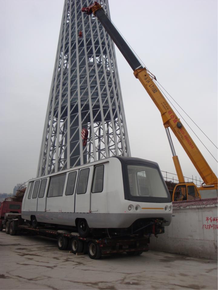 2010年3月20日,第一列广州地铁APM线列车进入广州塔停车场。APM列车为庞巴迪公司CX-100车辆,列车为橡胶轮胎的导向车辆,两节编组,列车之间客室不能连通。每节车厢共8个座位,两端各4个,额定载客138人,一节最高载客量为179人,有简易的司机操纵台,无司机室。