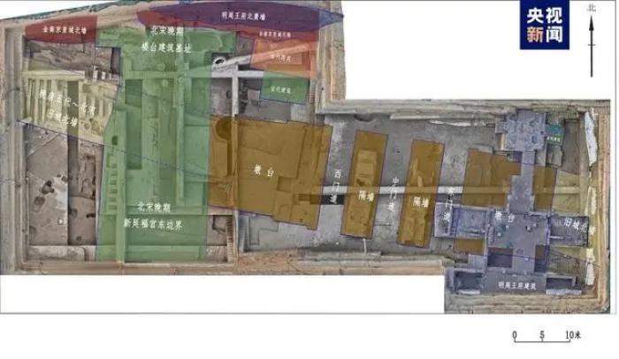 △开封-遗址北宋主要遗存分布图其中,景龙门遗址位于河南省开封市龙亭区,原是北宋东京城内城北墙中部城门。2023年至2024年的发掘显示,城门整体结构为一门三道式,由门道、隔墙及两侧墩台构成,通阔约60米、进深约19.3米。