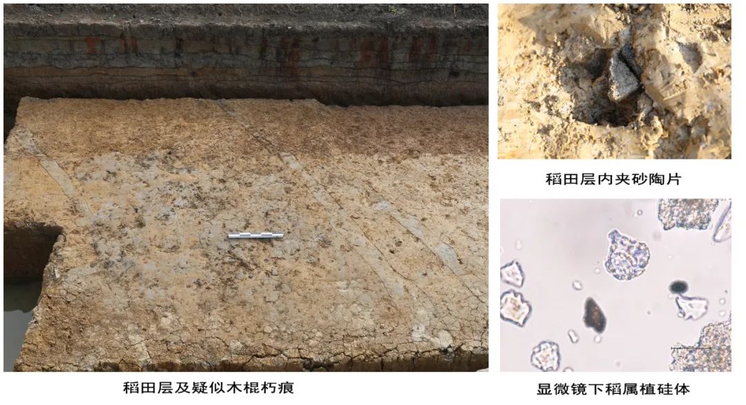 水稻田位于台地东侧,面积约15000平方米,局部区域发现垄坡和疑似木质遗物残留的朽痕,出土夹碳陶片。结合光释光测年结果,判断水稻田的年代为新石器时代上山文化至跨湖桥文化时期。