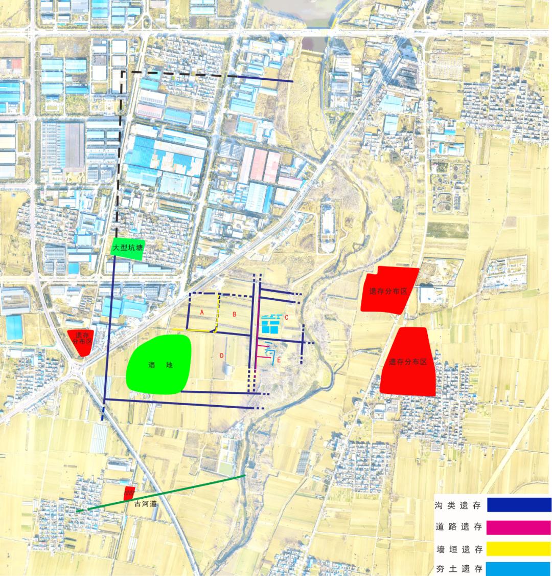 2号基址与1号基址东西并列,形制相似,目前仅揭露出西南角。手工业遗存区发现有墙垣和冶铜相关遗存。墙垣经多次修筑,底部有人祭现象,南墙保存较好,目前探明长度约190米;中部发现有大面积灰黑土堆积,出土有铜炼渣与炉壁等冶铜遗存,为寻找冶铜手工业作坊提供了线索。