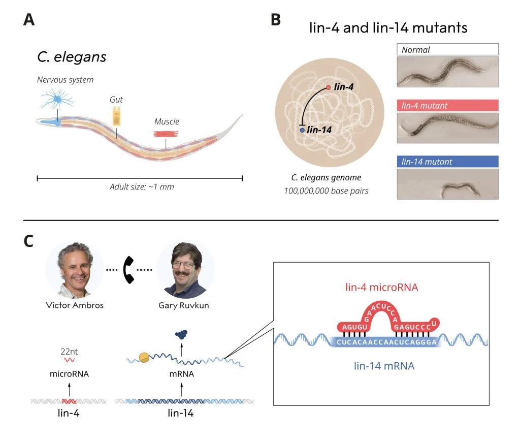 图2:(A) C. elegans是研究不同细胞类型生理过程的常用模型。(B) Ambros 和 Ruvkun 研究了 lin-4 和 lin-14 突变体。Ambros 已经表明 lin-4 似乎是 lin-14 的负调节因子。(C) Ambros 发现 lin-4 基因编码了一个microRNA,这种microRNA并不编码蛋白质。Ruvkun 克隆了 lin-14 基因,两位科学家意识到 lin-4microRNA序列与 lin-14 mRNA 中的互补序列相匹配。©诺贝尔生理学或医学委员会,插画 Mattias KarlénVictor Ambros 在完成博士后研究后,在哈佛大学新成立的实验室中,对C. elegans的 lin-4 突变体进行了深入分析。通过精确的基因定位,他成功克隆了该基因,并揭示了一个惊人的事实:lin-4 基因产生了一种异常短的RNA分子,这种分子并不编码蛋白质。这一发现颠覆了传统认知,表明这种microRNA实际上是抑制 lin-14 的关键因素。