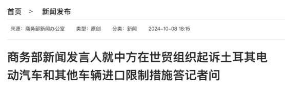 商务部新闻发言人就中方在世贸组织起诉土耳其电动汽车和其他车辆进口限制措施答记者问