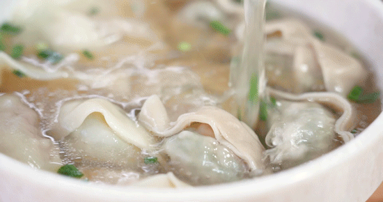 为了维持泡泡感,馄饨里的肉馅一定要少。煮馄饨时,锅要大、水要足,但一定不能沸腾。实际上,馄饨是烫熟的,下锅后数着秒,差不多要沸腾时轻轻搅动,果断捞起,滑入准备好的汤碗中。香气铺面,食欲满满!
