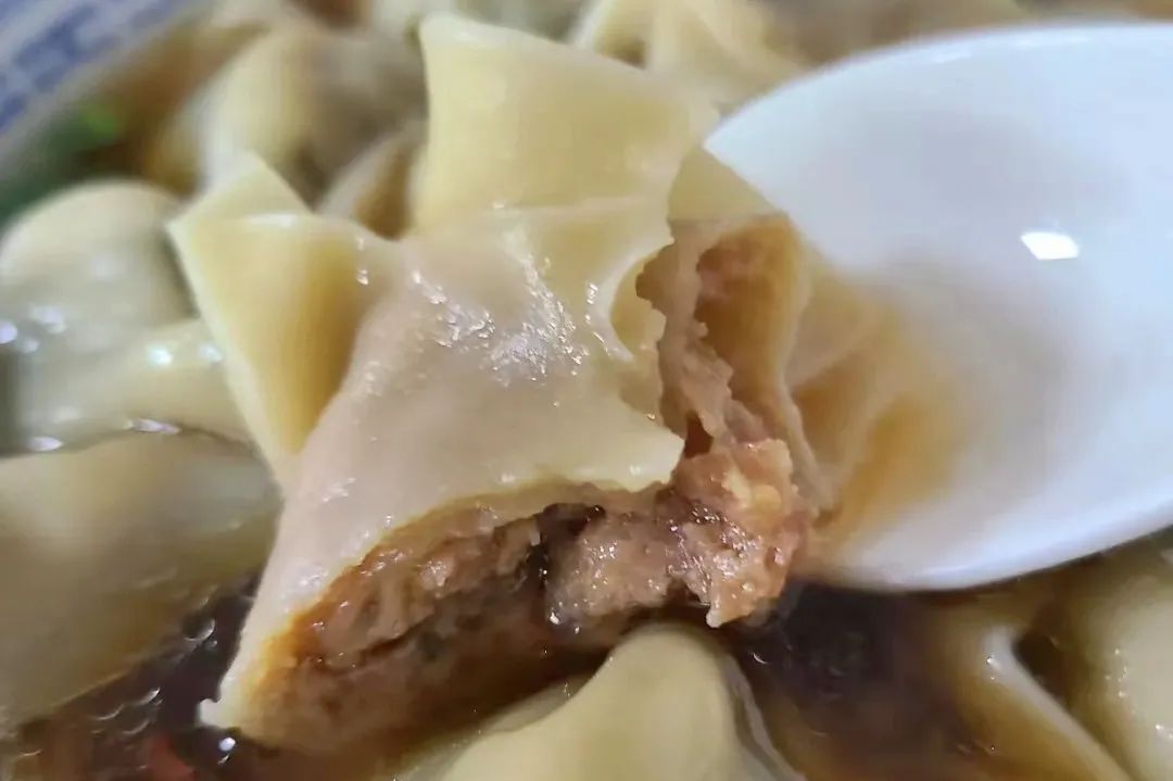 白皮馄饨在酱色的汤里沉浮,满满的视觉冲击。汤底是用秘制酱油和红辣椒油调制的,咸味出头,淡淡辣感收口。