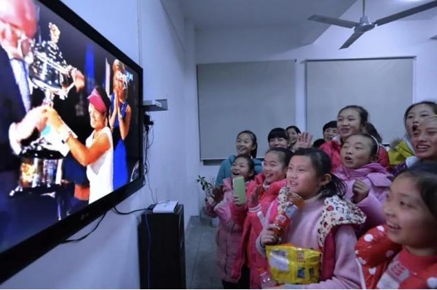 在李娜的家乡武汉,体育局汉江二桥训练基地里,11岁的郑钦文,和队友们守在电视机前为李娜欢呼。