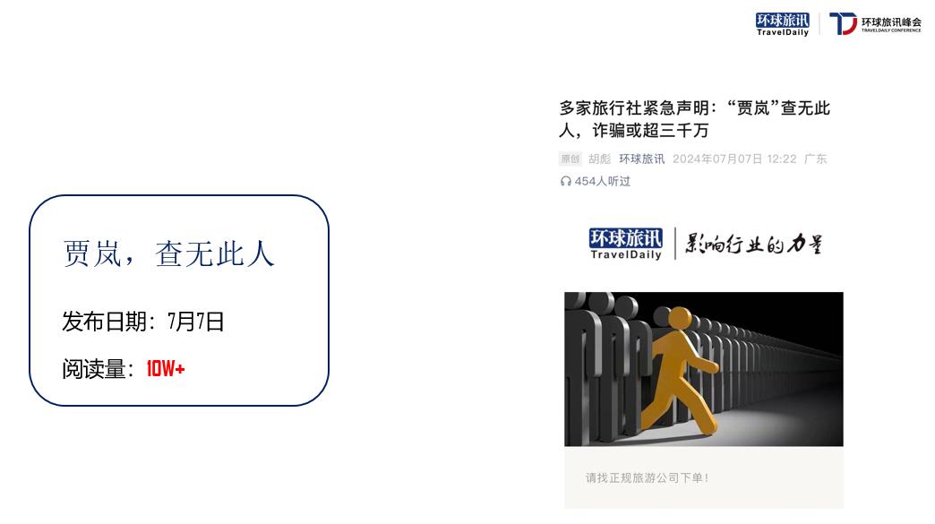 这篇是关于旅行社行业的一篇文章,这个事情有点黑色幽默。当时四川、深圳的一些旅行社,同一时间发布公告,说他们公司没有一个叫贾岚的人。