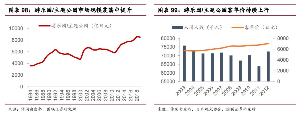 关于景区这种业态,更有价值的视角是什么呢?比如,我们看邻国日本,它出现经济危机,在“失去的30年”的时候,旅游消费虽然受到巨大冲击,但游乐园和主题乐园板块一直是震荡上行的状态。