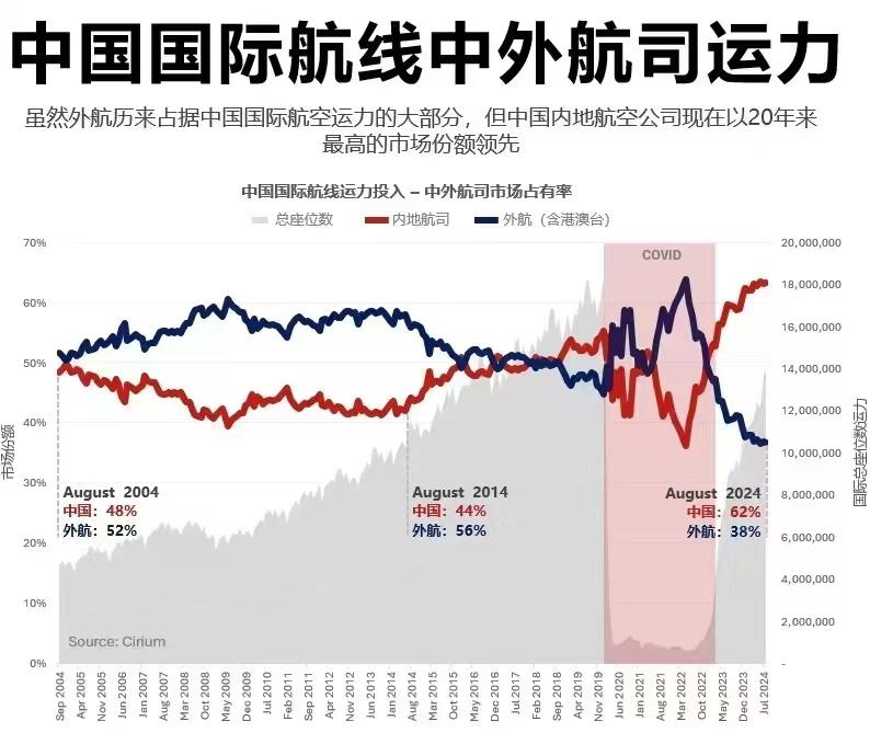 从数据来看,最近20年在中国国际航班这个板块里边,外航其实一直是有优势的。但是从2023年开始,中国航司的运力就一直在往上走,外航掉头一直在往下走。这个可以看作是一个非常明确的分水岭,中外航司的运力在此消彼长。