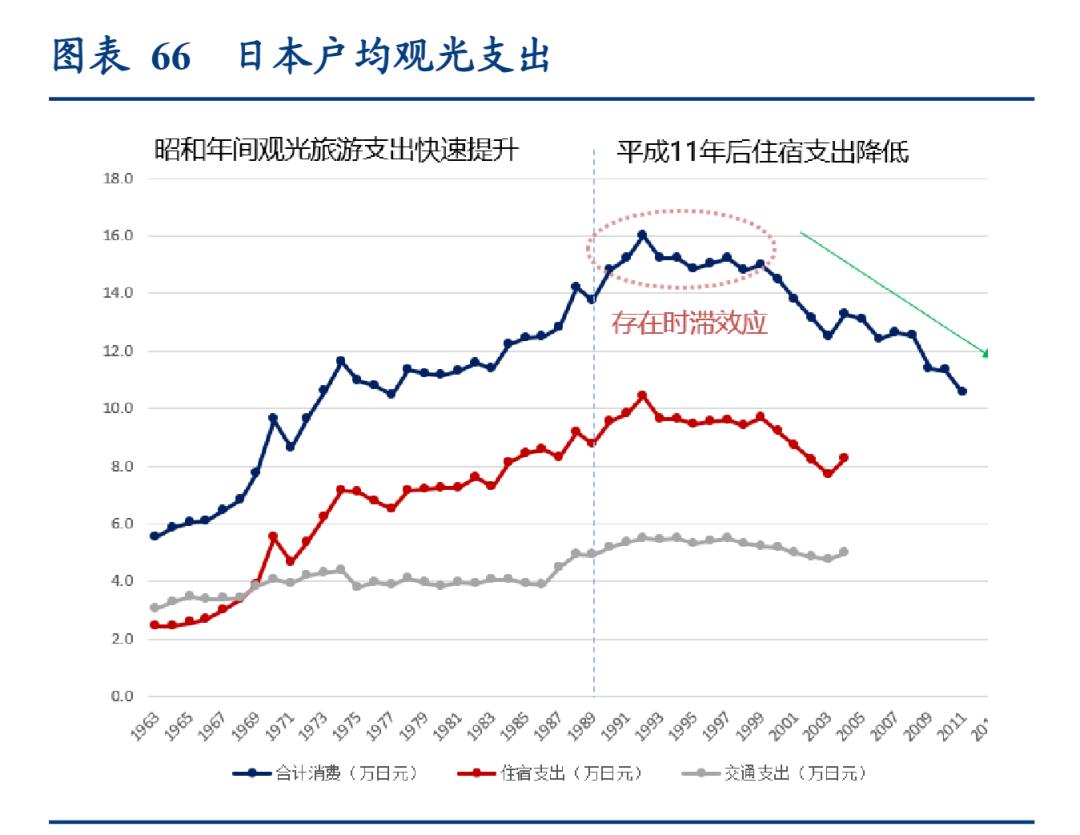 它的家庭旅游消费,呈现出来非常有趣的一个点:在失去的30年,最初的那前10年仍保持一个高位横盘的一个状态。也就是说日本的家庭旅游支出没有增长了,但它依然保持一个差不多持平的存量,一直维持了10年。