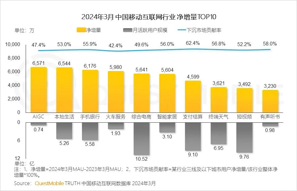 QuestMobile数据显示,今年3月,在中国移动互联网行业净增量Top 10中,本地生活领域,下沉市场的贡献率为53%。