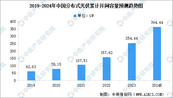 随着“双碳”行动方案的实施和“整县开发试点”工作的推进,中国分布式光伏并网容量呈高速增长趋势。中商产业研究院发布的《2024-2029年中国分布式光伏行业市场前景预测及未来发展趋势研究报告》显示,截至2023年底中国分布式光伏累计并网容量254.44GW。2024年上半年,中国分布式光伏累计并网容量309.51GW。中商产业研究院分析师预测,2024年全年中国分布式光伏累计并网容量将达到364.44GW。