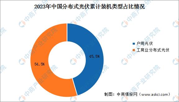 分布式光伏作为一种清洁、高效、灵活的能源利用方式,具有广阔的发展前景和应用潜力。分布式光伏主要包括户用光伏和工商业光伏两部分,户用光伏主要面向家庭用户,规模较小;而工商业分布式光伏则面向工商业用户,规模较大,通常安装在工厂、商业建筑等屋顶上。2023年,中国户用光伏和工商业分布式光伏累计装机容量占比分别为45.5%和54.5%。