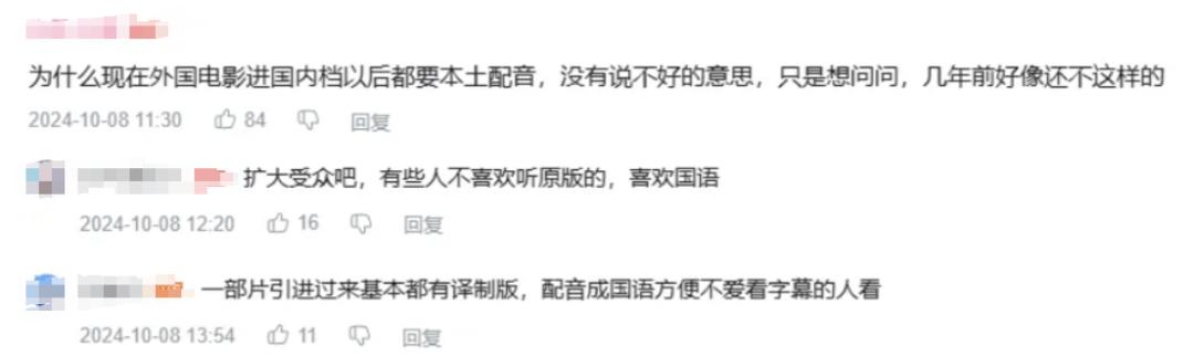 于是现在的外国电影引进国内时,国内配音的版本依旧会有,但越来越没有人关注,甚至已经有年轻新观众对中文配音这件事感到陌生。