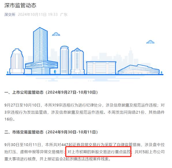 值得一提的是,深交所11日晚间发布深市监管动态。其中提到,9月30日至10月11日,深交所对上市初期的新股交易进行重点监控。
