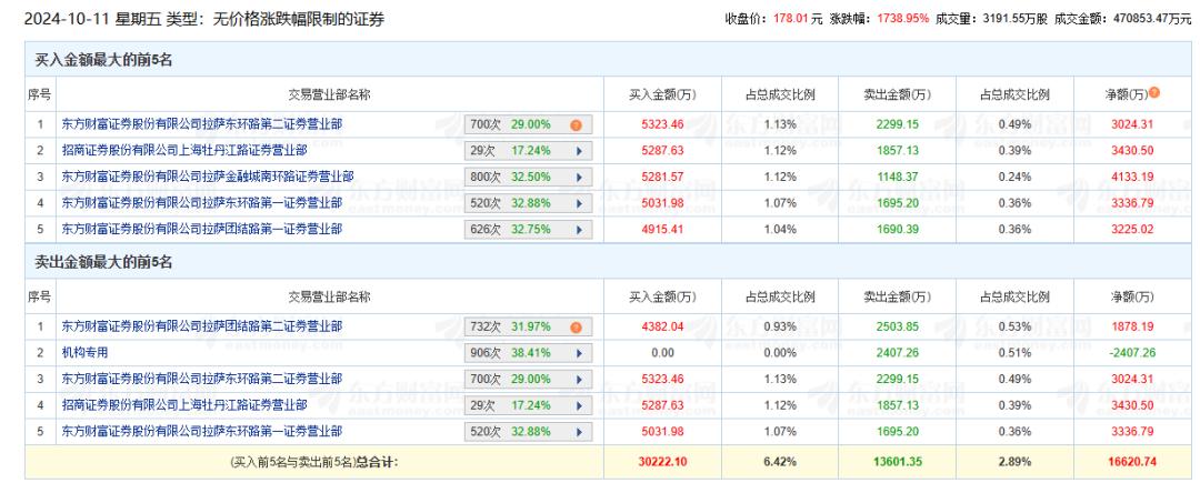 盘后龙虎榜显示,参与其中的资金主要是散户及游资集中的营业部,东方财富旗下“拉萨天团”在买入前五中占据四席。