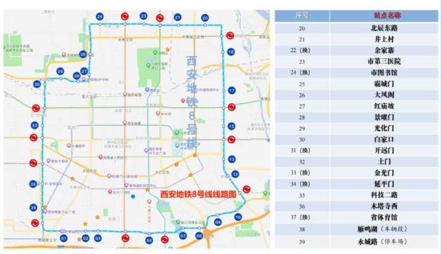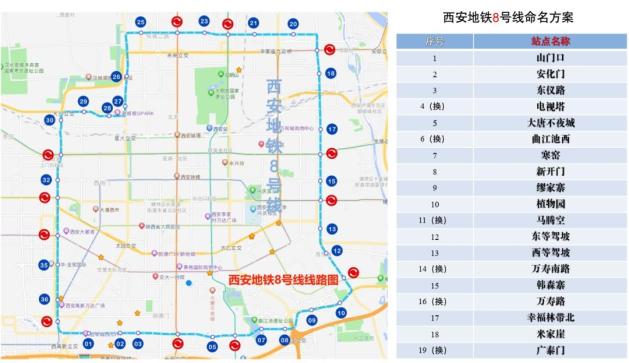 8号线站名山门口、安化门、东仪路、电视塔(2号线已命名换乘站)、大唐不夜城、曲江池西(4号线已命名换乘站)、寒窑、新开门、缪家寨、植物园、马腾空(5号线已命名换乘站)、东等驾坡、西等驾坡、万寿南路(6号线已命名换乘站)、韩森寨、万寿路(1号线已命名换乘站)、幸福林带北、米家崖、广泰门(3号线已命名换乘站)、北辰东路、井上村、余家寨(4号线已命名换乘站)、市第三医院、市图书馆(2号线已命名换乘站)、霸城门、大风阁、红庙坡、景曜门、光化门、白家口、开远门(1号线已命名换乘站)、土门、金光门(5号线已命名换乘站)、延平门(3号线已命名换乘站)、科技二路、木塔寺西、省体育馆(6号线已命名换乘站)、雁鸣湖(车辆段)、永城路(停车场)。