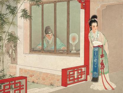 王叔晖《听琴》(《西厢记》),工笔重彩(四条屏年画),1954年