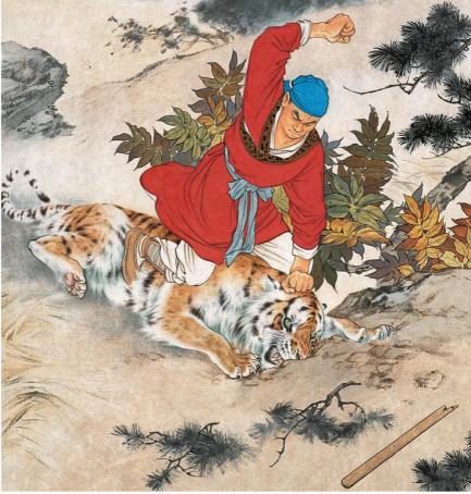 刘继卣《武松打虎》,工笔重彩(四条屏年画),1956年