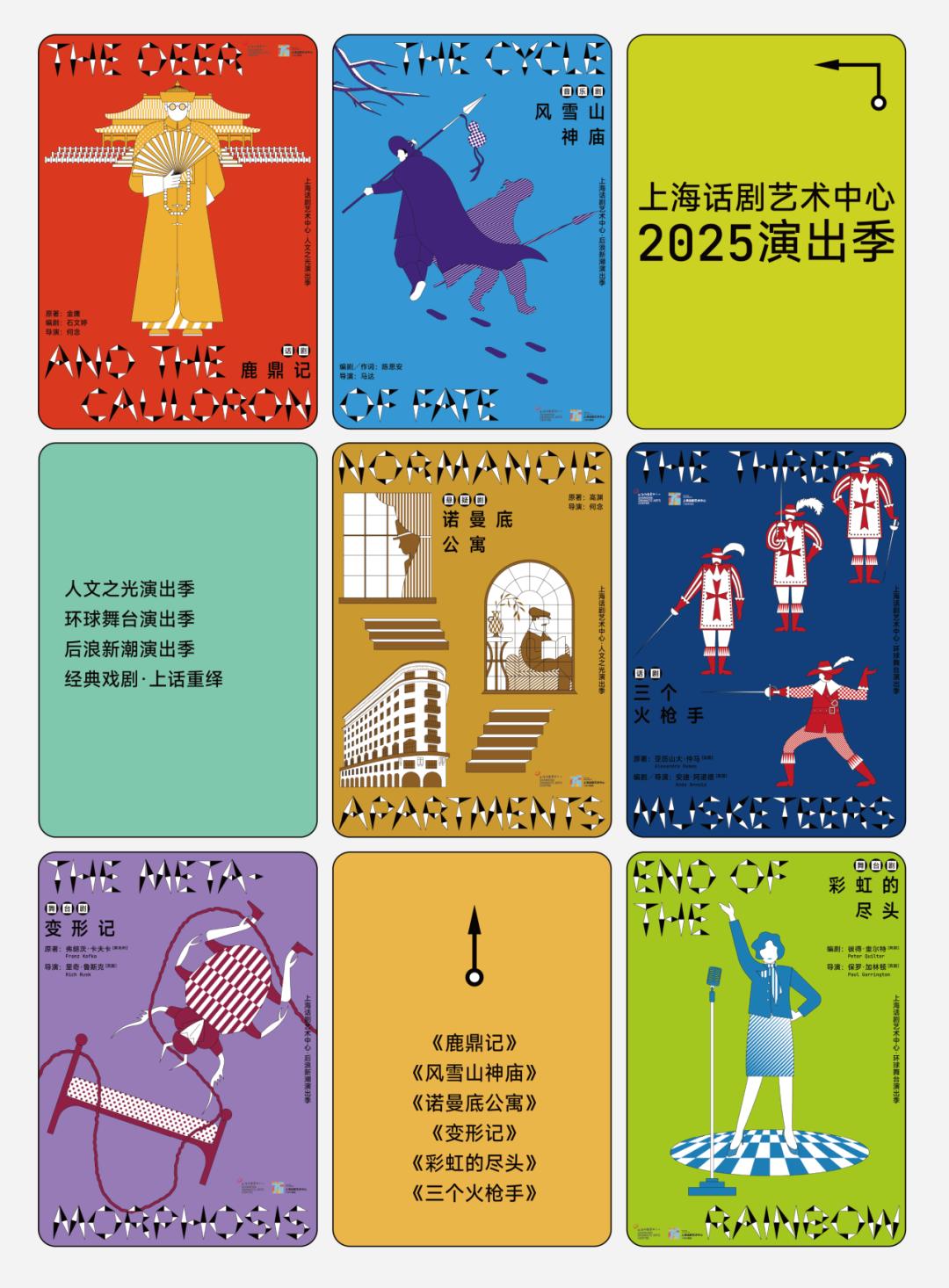 上海话剧艺术中心率先揭晓了全新演出年的六大亮点剧目,包括:中国武侠小说宗师金庸封笔之作、全新创作的话剧《鹿鼎记》;取材于《水浒传》的音乐剧《风雪山神庙》;根据高渊同名小说改编的悬疑剧《诺曼底公寓》;以当代视角重新解构卡夫卡经典作品的舞台剧《变形记》;讲述好莱坞传奇人物朱迪·嘉兰人生最后时光的舞台剧《彩虹的尽头》;全新改编法国“通俗小说之王”大仲马代表作的话剧《三个火枪手》。