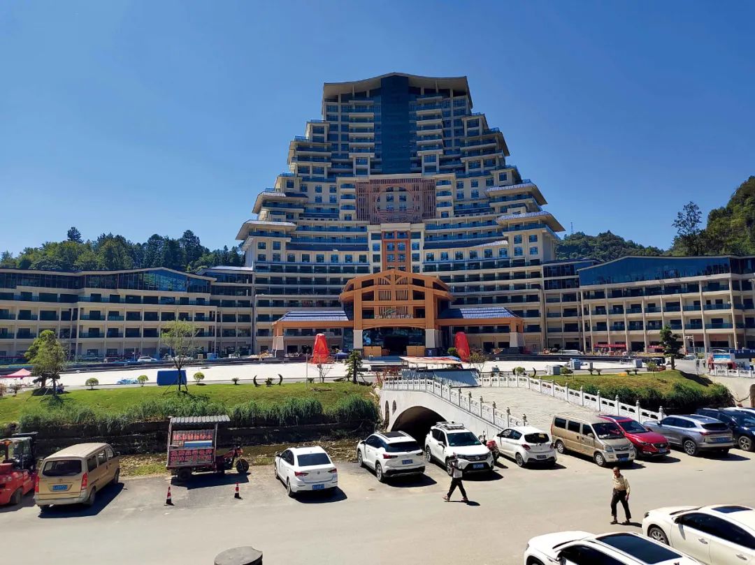 这个在建酒店曾有个更广为人知的名字——“天下第一水司楼”。2016年,水司楼动工,不到两年后,因资金链断裂等,这座举债约2亿元的网红建筑停工,其也成为独山县“不顾民生盲目举债”的典型项目。