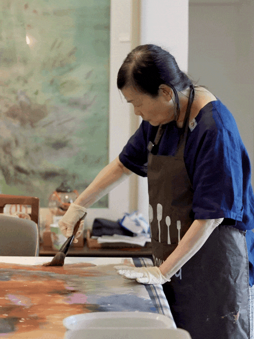 最近搬到这里来,她又开始画画了,很多人来我们家,说这幅画好特别,很多朋友想要买她的画。她每天早上5点起来,已经在餐厅画了好多幅,到七八点我起床,迷迷糊糊还没醒,一看地上色彩缤纷,满地都是画。我说你等一等,让我先把早餐慢慢吃完,然后戴上眼镜坐在那儿看画,一看半个钟头。