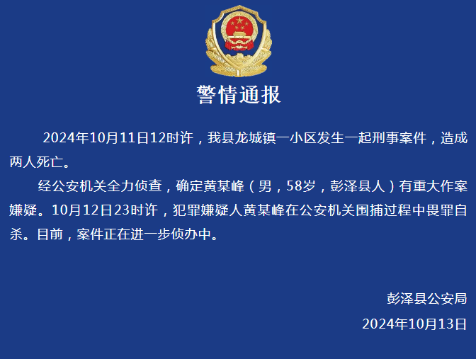 3.江西发生刑事案件致2人死亡,犯罪嫌疑人畏罪自杀:13日,江西九江市彭泽县公安局发布通报称,11日12时许,彭泽县龙城镇一小区发生一起刑事案件,造成两人死亡。经公安机关全力侦查,确定黄某峰(男,58岁,彭泽县人)有重大作案嫌疑。当日23时许,犯罪嫌疑人黄某峰在公安机关围捕过程中畏罪自杀。目前,案件正在进一步侦办中。(法治日报)