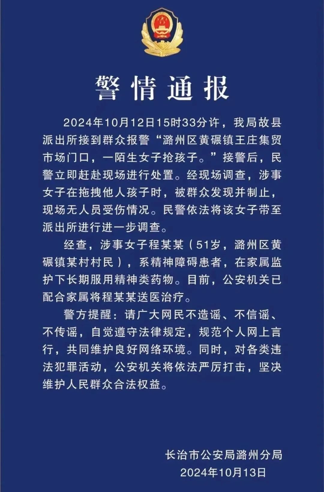10月13日,山西省长治市公安局潞州分局发布警情通报,2024年10月12日15时33分许,故县派出所接到群众报警称,在某集贸市场门口,一陌生女子抢孩子。经现场调查,涉事女子在拖拽他人孩子时,被群众发现并制止,现场无人员受伤情况。经查,涉事女子程某某系精神障碍患者,在家属监护下长期服用精神类药物。通报全文如下↓(央广网、“平安潞州”微信公众号)
