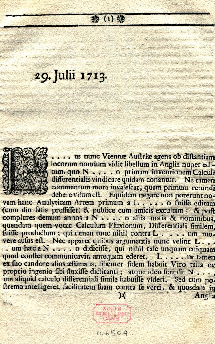 英国皇家学会1712年,英国皇家学会成立了一个调查牛顿—莱布尼兹微积分优先权的专门委员会,委员会实际上处于牛顿的操纵之下。1713年初,委员会发布公告: 确认牛顿是微积分的第一发明人。莱布尼兹向英国皇家学会提出申诉,并自己起草和印发了一份《快报》,指责委员会的严重不公。