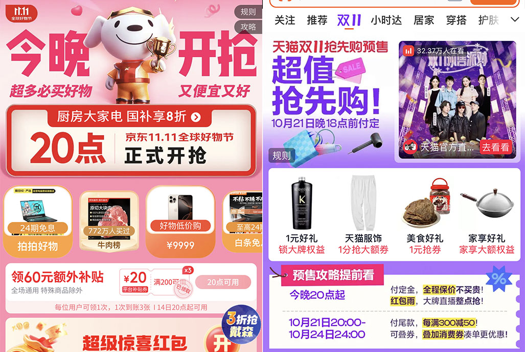 国庆节的假期刚刚结束,各大平台便纷纷进入到促销模式,其中,天猫即将在10月14日开启第一波预售活动,相较于去年,时间上提前了整整10天;抖音则把10月8日至17日设为双十一的预热期;京东也不甘落后,在10月12日启动了双十一的预购活动;拼多多的百亿补贴也同样提前启动了。