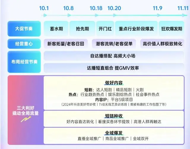 快手的双十一招商自9月19日启动,10月10日开启预售。平台提供200亿流量补贴,通过全域协同策略,包括短视频、直播和商城,以促进商家多渠道增长。特别针对家居电器、女装亲子等行业提供细化扶持。